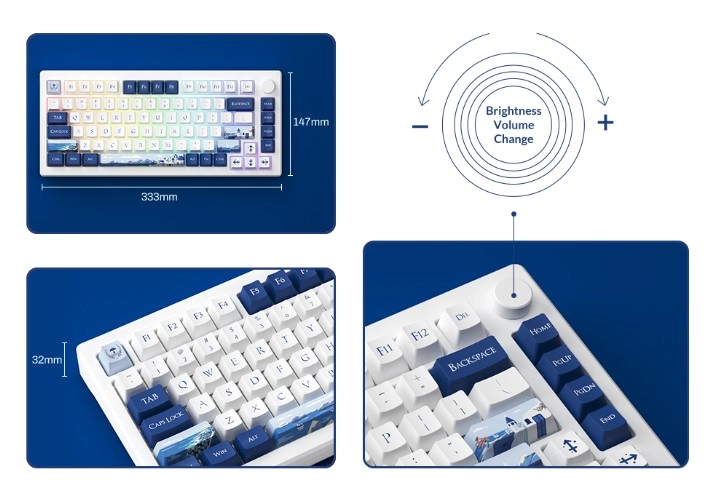 Với layout 75%, bàn phím vẫn giữ đầy đủ cụm phím chức năng cần thiết như F-row, arrow keys,... nhưng có kích thước nhỏ gọn hơn, phù hợp với các setup bàn làm việc hiện đại và gọn gàng. Kích thước tổng thể 333 x 147 x 32mm, nặng 1kg, vừa vặn để mang theo mà vẫn đầm tay khi dùng.