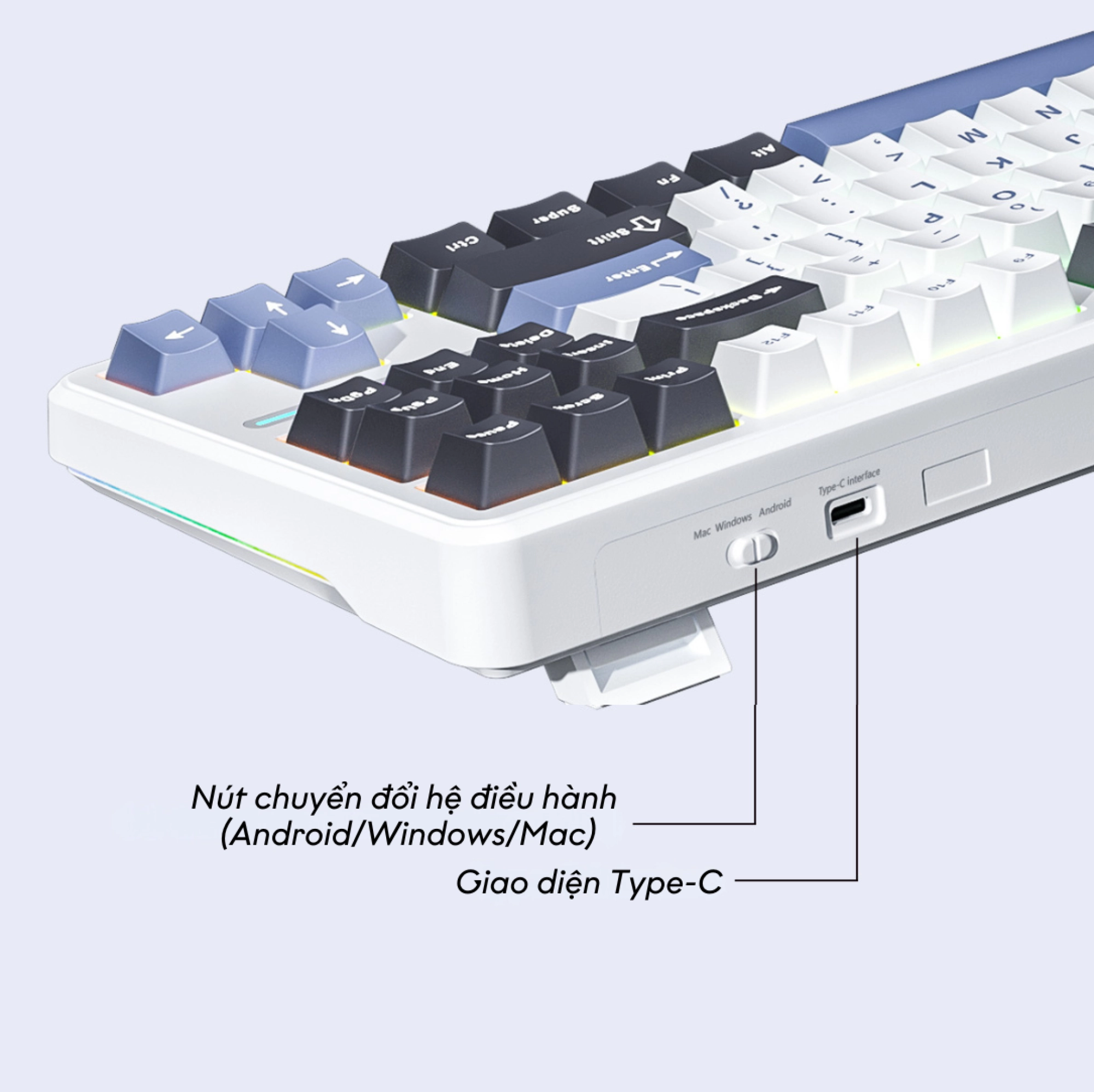 Aula F87 có layout 87 phím tiêu chuẩn, loại bỏ cụm numpad nhưng vẫn giữ lại cụm điều hướng, phím chức năng và các tổ hợp cần thiết cho cả công việc và chơi game. Phối màu đen – trắng – xanh dương tạo cảm giác trẻ trung, hiện đại, giúp setup của bạn thêm phần nổi bật. Trọng lượng khoảng 826g (không tính cáp) giúp bàn phím bám chắc trên mặt bàn.
