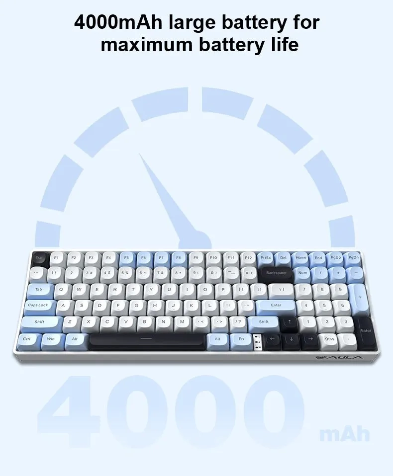 Aula S100 PRO được trang bị viên pin lithium 4000mAh, có thể hoạt động liên tục khoảng 32 giờ khi sử dụng hiệu ứng ánh sáng mặc định, và lên đến 132 giờ nếu tắt LED. Thời gian sạc đầy khoảng 8.5 tiếng qua cổng Type-C với điện áp DC 5V. Với trọng lượng khoảng 928g (không dây) và kích thước nhỏ gọn, sản phẩm thuận tiện mang theo, phù hợp cho người thường xuyên di chuyển.
