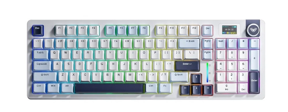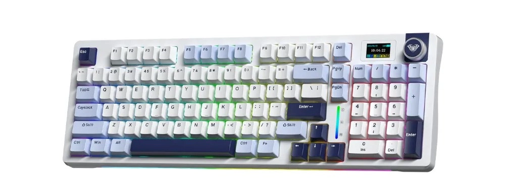 Aula S98 PRO mang phong cách trẻ trung và cuốn hút với phối màu xanh dương – trắng – tím đậm, tạo điểm nhấn ấn tượng cho góc máy. Layout 96 phím tối ưu không gian, giữ đầy đủ chức năng cần thiết cho cả game thủ và người dùng văn phòng. Điểm đặc biệt là màn hình LCD 1.14 inch giúp hiển thị trạng thái pin, kết nối và hình ảnh, kết hợp cùng núm xoay đa chức năng, nâng tầm trải nghiệm người dùng.