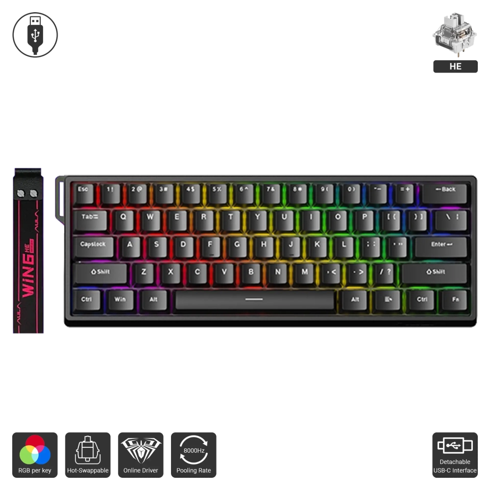 Bàn phím cơ gaming Aula WIN60HE có dây là sự kết hợp hoàn hảo giữa hiệu năng, độ bền và thiết kế hiện đại. Với tốc độ phản hồi cực nhanh, switch từ tính tinh chỉnh chính xác và đèn nền RGB rực rỡ, sản phẩm đáp ứng mọi nhu cầu từ chơi game chuyên nghiệp đến làm việc hàng ngày, mang đến trải nghiệm gõ phím vượt ngoài mong đợi.