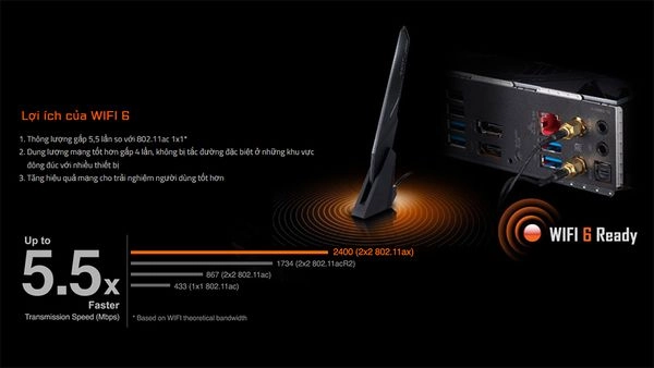 Giải pháp không dây 802.11ax WIFI 6 với băng tần 6GHz chuyên dụng mới, cho phép hiệu suất không dây gigabit, truyền phát video mượt mà, trải nghiệm chơi trò chơi tốt hơn, ít bị rớt kết nối và tốc độ lên tới 2,4Gbps*. Hơn nữa, Bluetooth 5 cung cấp phạm vi gấp 4 lần so với BT 4.2 và truyền nhanh hơn.