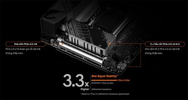 Sở hữu khe cắm PCIe 4.0 có tốc độ kết nối tăng gấp đôi so với thế hệ 3.0, băng thông có thể đạt tới 64GB/s. Khe cắm hỗ trợ được cố định vào bo mạch chủ bằng các điểm hàn bổ sung và hỗ trợ trọng lượng của cạc đồ họa nặng.