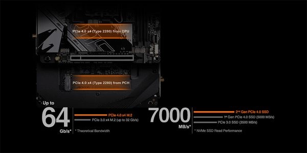 Bo mạch chủ AORUS cung cấp khả năng tương thích tốt nhất trong ngành về lưu trữ NVMe cho người dùng yêu cầu dung lượng cao và tìm kiếm hiệu suất tốt nhất. Nâng cấp với SSD Gen4 thế hệ thứ 2 mới nhất, hiệu suất lên tới 7000 MB/giây, nhanh hơn tới 2 lần so với SSD PCIe3.0.